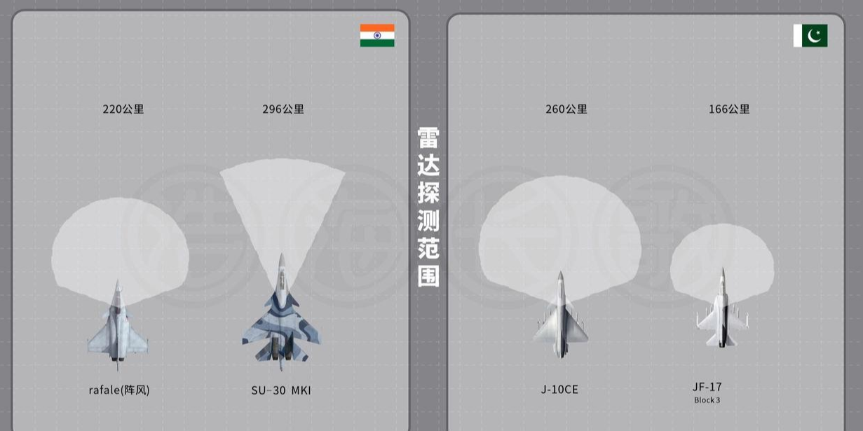 与美国F-16V处于同一水平,略逊于F-15EX,200公里左右的雷达探测距离,加上有源相控阵体制,让其拥有了比苏30mki更广阔的视角范围,120度的探测扇面不再有探测盲区的短板,电子战能力和多任务能力都相较于三代机有了质的提升,对巴基斯坦威胁甚大。
