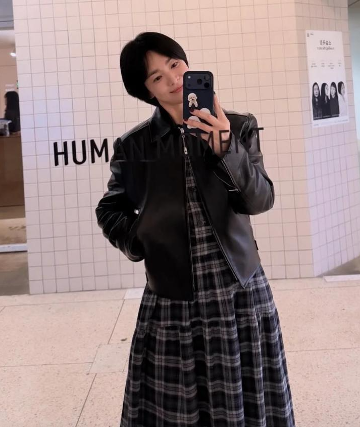 宋慧乔在自己的个人社交账号上晒出了她观看展览时拍的照片,向粉丝们分享了她在新剧杀青后的生活动态。在照片中可以看到宋慧乔穿着格子纹连衣长裙,搭配黑色的皮衣外套与黑皮长靴,留着中分的短发,这让她看起来十分酷飒,又略带一种淡淡的文艺风格。