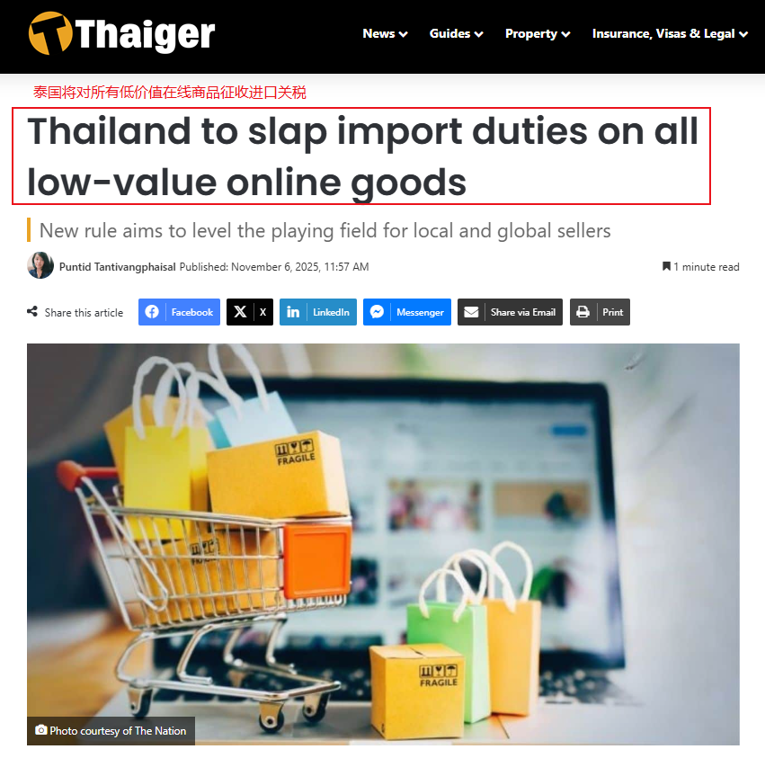 泰国海关总署近日宣布,从2026年开始,将全面取消针对1500泰铢以下跨境商品的免税优惠,这意味着所有通过电商渠道进入泰国的货物都将从最低金额起开始课税。