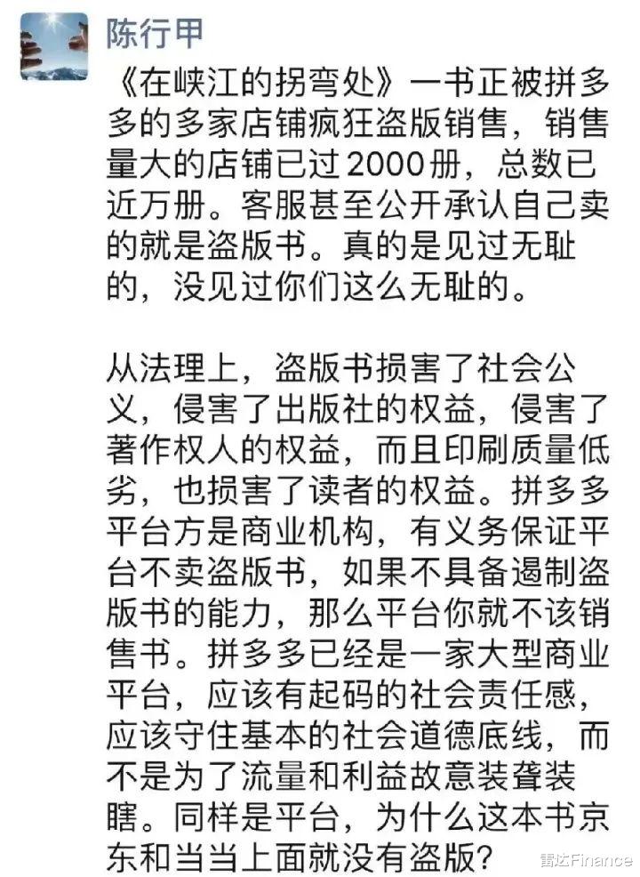 截图中,陈行甲“义愤填膺”地表示,拼多多平台方作为商业机构,有义务保证平台不卖盗版书,“应该有起码的社会责任感应该守住基本的社会道德底线,而不是为了流量和利益故意装聋装瞎”。陈行甲在文末还提出质疑,“同样是平台,为什么这本书京东和当当上面就没有盗版?”