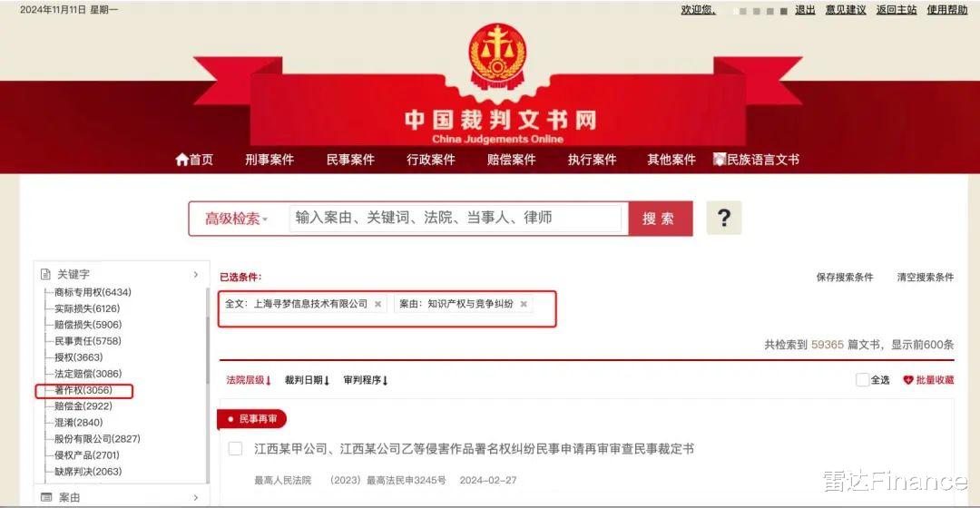 在裁判文书网站网站上,雷达财经在11月11日晚间,以拼多多的主体公司——上海寻梦信息技术有限公司(以下简称“寻梦公司”)作为关键字搜索出的结果为 68282 篇,其中,涉及知识产权竞争纠纷的有59365篇;涉及著作权纠纷的有3056条,其中判决文书 2904 篇。