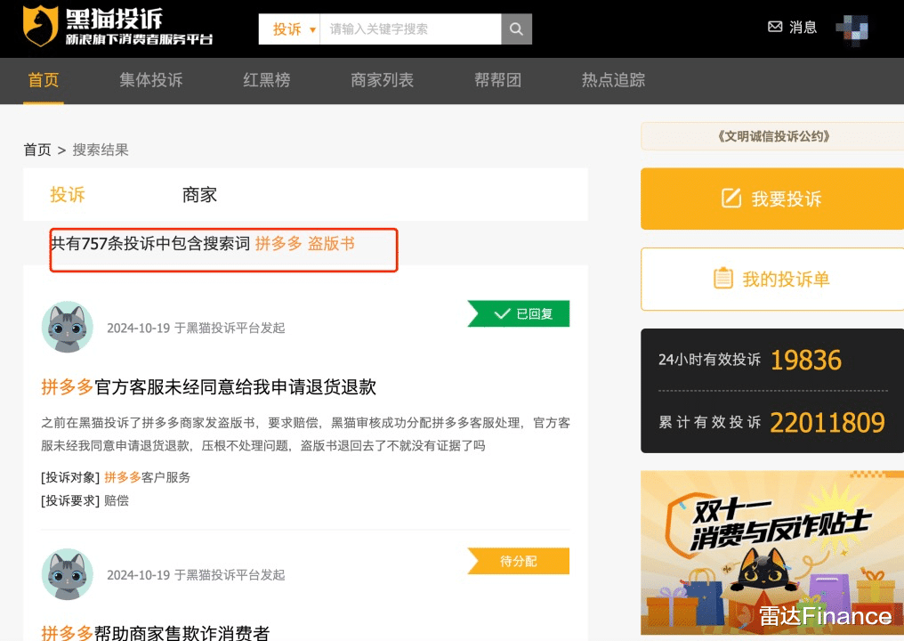 事实上,拼多多的盗版书问题曾多次被人公开指出,但问题一直未得到有效解决。早在2018年,郑渊洁就曾公开指出拼多多的盗版问题。如今时隔6年过去,盗版问题仍未解决。雷达财经注意到,在黑猫投诉平台上,关于拼多多盗版书问题上,拼多多投诉高达757件,这一数字甚至高于另两家平台——淘宝和京东之和。
