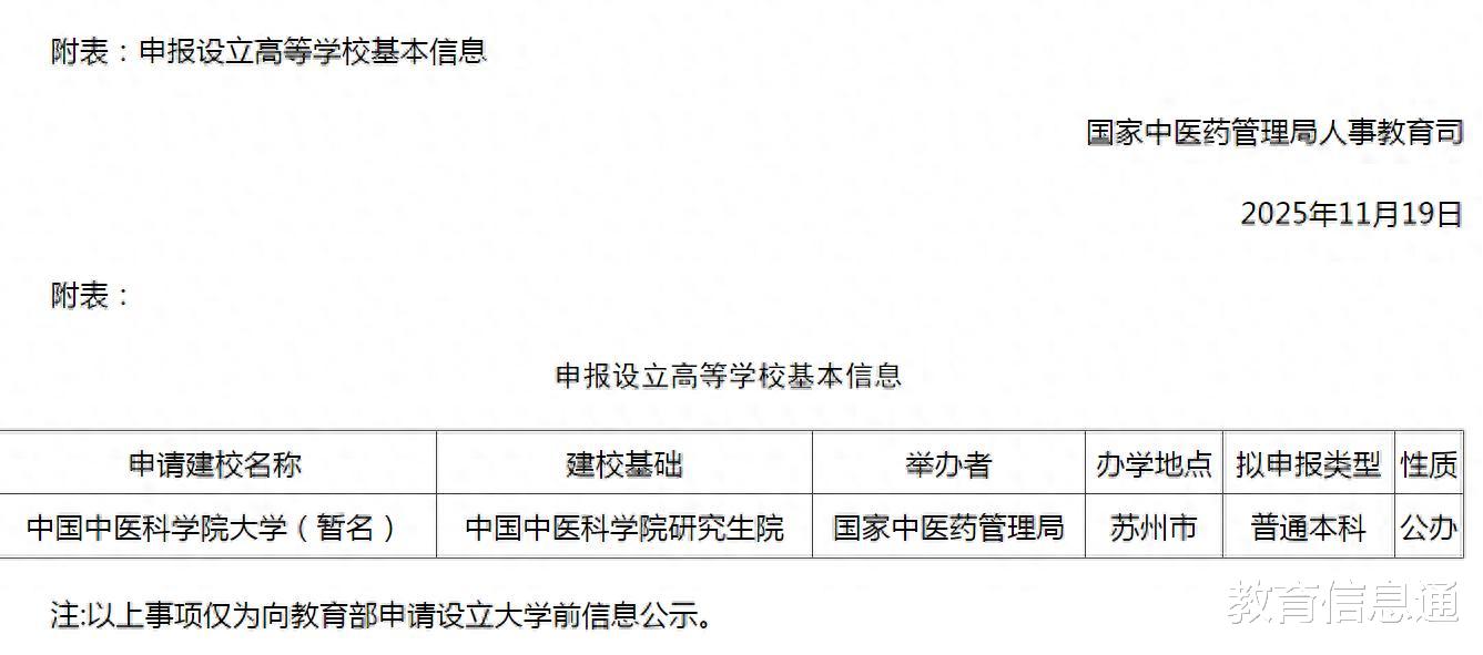 11月20日,国家中医药管理局官网发布《关于高等学校设置事项的公示》,根据《中华人民共和国高等教育法》《普通本科学校设置暂行规定》等有关法律法规,经组织专家指导、考察、评议,拟按程序向教育部申报设立中国中医科学院大学(暂名),现予以公示。