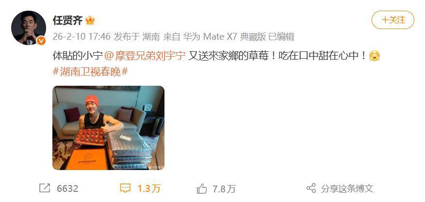任贤齐晒刘宇宁送的丹东草莓:“吃在口中甜在心中!”