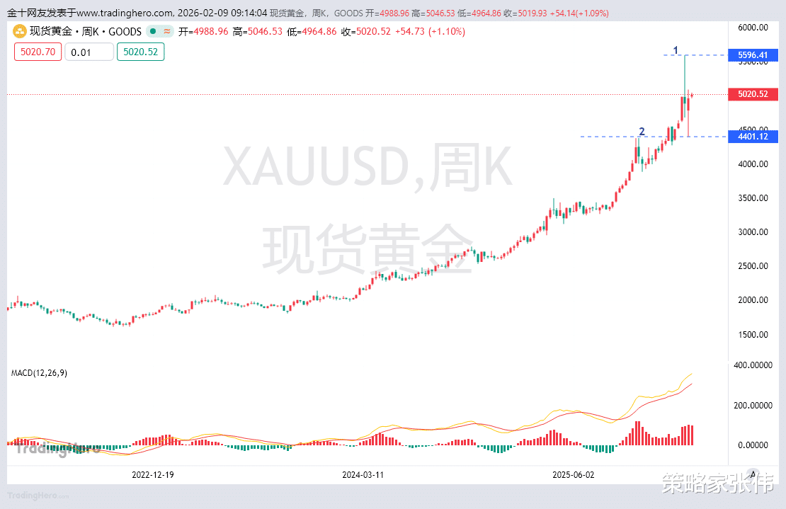 黄金周线级别来看,高点5600一线,低点4400一线,黄金上影线,黄金下引线,可以带来无尽的想象力。