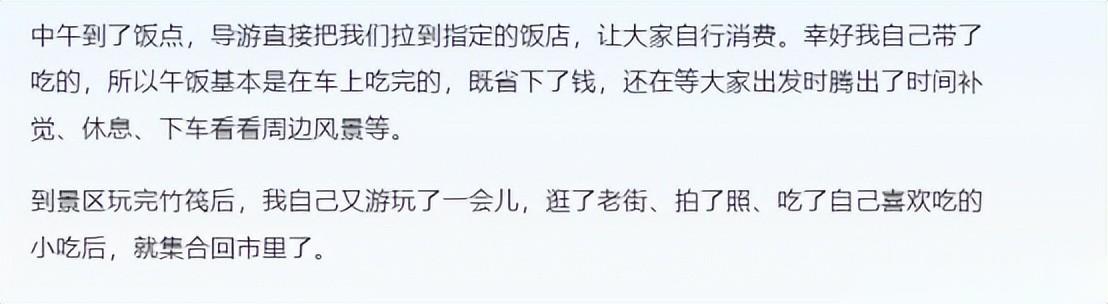 到了中午吃饭的地方,她更是直接从包里掏出自己带的面包,在车上就把午饭解决了,压根不进那个指定的饭店。