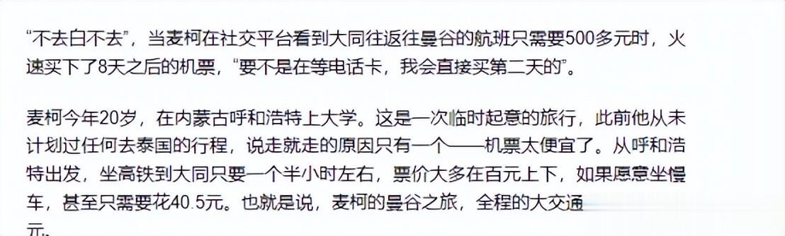 这买卖对北京的年轻人来说更划算,从北京直接飞曼谷,来回得2300多,但要是先坐高铁到大同再飞,所有费用加起来700块都不到,直接省出一大半。