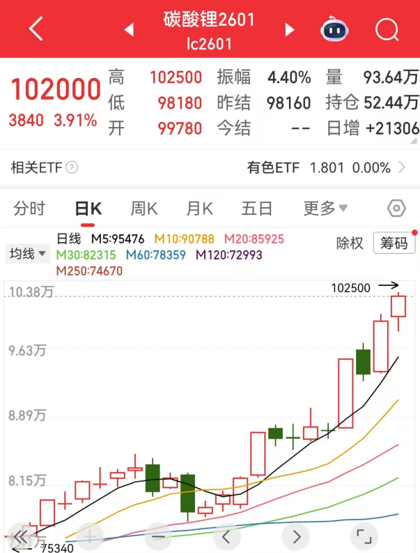 2025年11月,碳酸锂期货主力合约2601的价格突破10万元/吨,而6月最低时不过5.85万元/吨,数月之内涨幅超过70%。