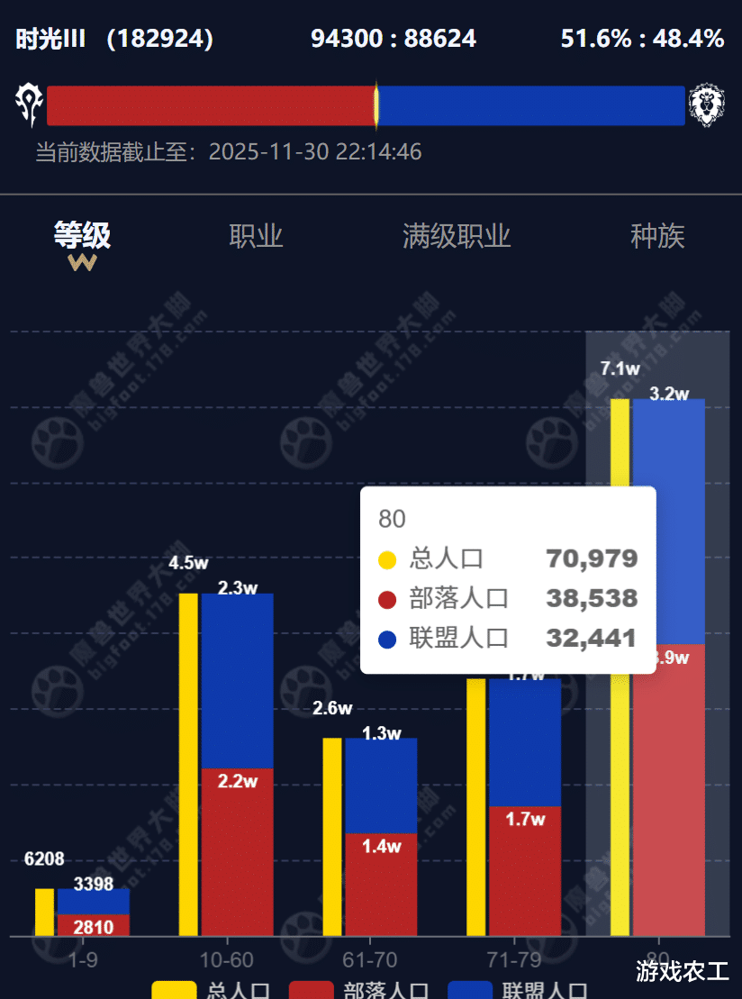 因为目前没有找到一些关于时光服3服昨天被联盟屠城的视频,所以只能以大脚插件的数据进行分析。从数据来看,其实会发现似乎部落玩家的人数上会有一点优势,而联盟活跃角色只有8.8万,但是部落活跃角色有9.4万,并且满级角色也是部落更多,所以为什么部落打输了PVP让玩家有点不太理解。当然,不可能每个玩家都参与PVP,这很正常。