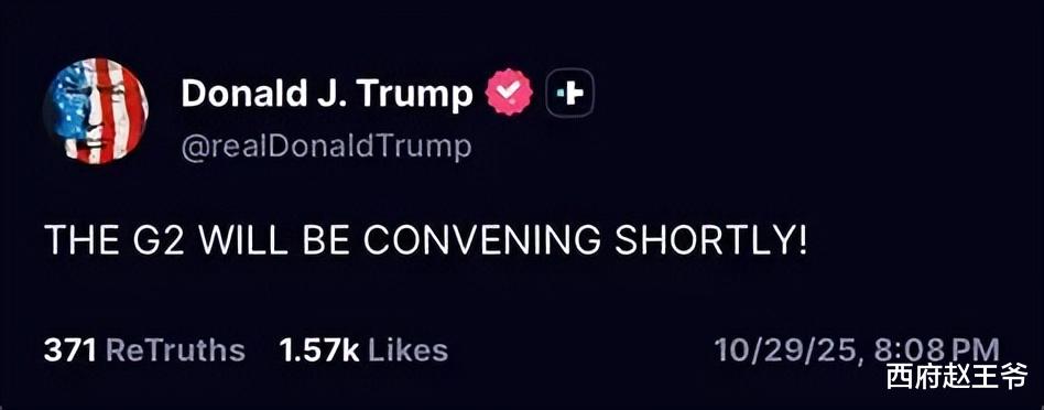 10月30日,备受瞩目的中美峰会开启前大约1小时,特朗普在社交媒体上发文:“THE G2 WILL BE CONVENING SHORTLY!”。
