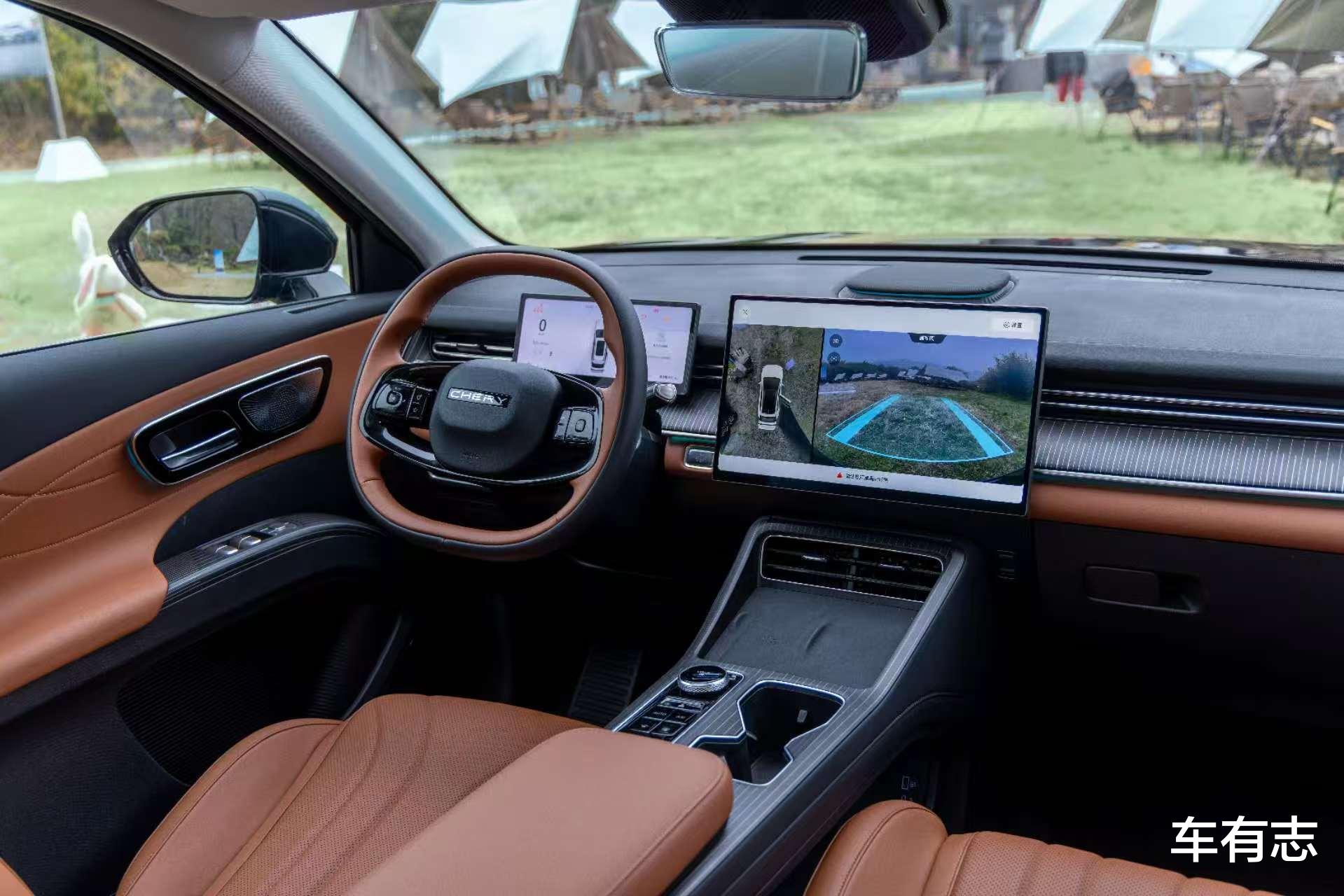 来到车内,第五代瑞虎8采用了黑棕双拼色的设计,更显豪华,同时对应外观的不同,内饰也分为了两套设计风格。其中虎款采用了横置悬浮式中控大屏,豹款则采用了一体式竖置中控大屏,尺寸分别为15.6英寸和13.2英寸,内置8155车规级芯片,可在30秒内响应超过20条指令,支持全品牌手机互联Hicar/Carplay/Carlink。在中控屏下方,第五代瑞虎8还保留了部分空调实体按键,同时提供了手机无线充电功能。