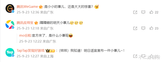 俗话说“新闻字数越少,事情越大”,何况这次是腾讯旗下微博官号全家桶集体发文,显然不可能是小事。这番操作瞬间引发了玩家社群的热议,大家都在猜明天究竟会出什么“小事”。