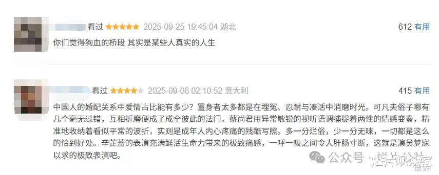 她的状态其实和现在处于低谷迷茫期的朋友有些相似,所以口碑自然会两极分化,过得好的朋友只会觉得故事狗血,感受不到她的处境