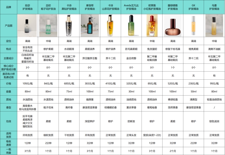在深入测评之前,先来看一下这几款护发精油产品的基础,这将帮助大家更好地了解它们的主要功能和特点。