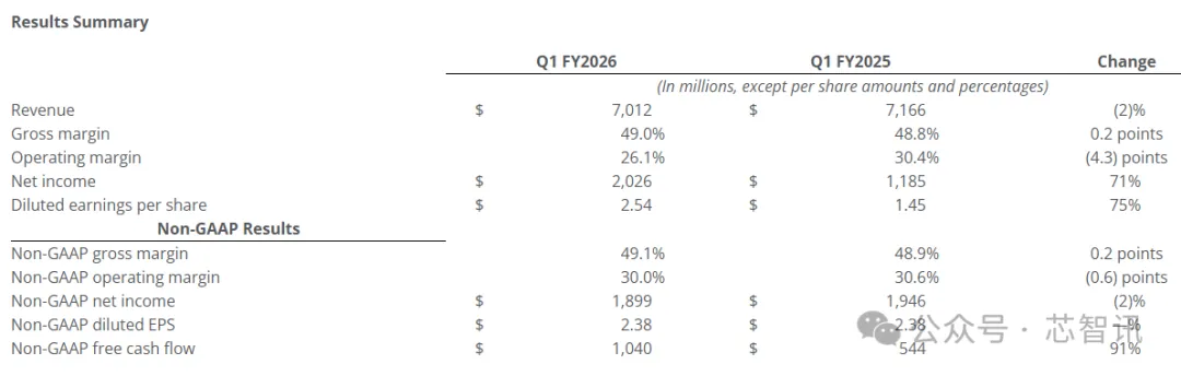 根据财报显示,应用材料第一季营收为70.1亿美元,同比下滑2%,环比增长3%。依据一般公认会计准则(GAAP),应用材料的毛利率达到49.0%,营业利润为为18.3亿美元,净利润达20.26亿美元,同比大涨71%。GAAP每股收益(EPS)为2.54美元,较上年同期的1.45美元大涨75%。若以非一般公认会计准则(Non-GAAP)计算,毛利率为49.1%,营业利润为21.1亿美元,每股收益为2.38美元,与2025年同期持平。