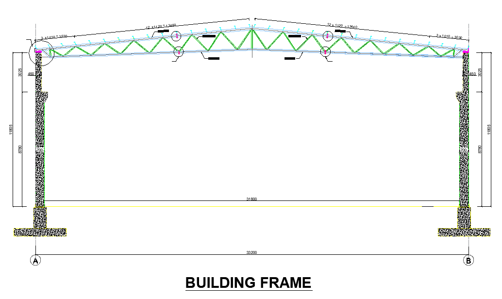 该项目为桁架式轻钢屋面厂房结构,总长104米,宽33.2米,檐口高度12米,主体采用平面矩形管桁架结构,并在桁架上下弦设置屋面支撑。项目涵盖钢屋架、檩条、抗风柱、吊车梁及雨棚等部分的设计与加工制作,总用钢量约170吨。项目设计充分考虑当地使用需求,纵向布置两台10吨吊车,西侧山墙面另设5吨吊车,结构整体坐落于已完工的混凝土柱上,兼顾实用性与安全性。