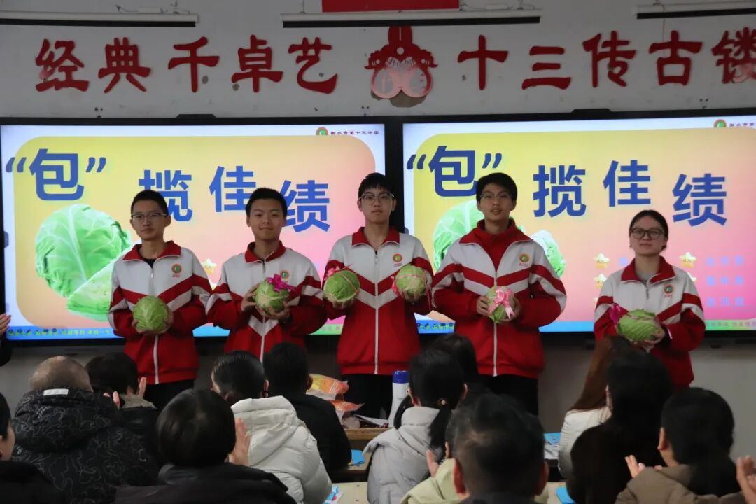 各班为表现优秀、进步显著的同学们颁发了专属奖励——既有承载着肯定与期许的定制奖状抱枕,更有寓意深刻的“蔬菜奖品”:芹菜寓意天道酬“芹”,萝卜象征拼“卜”进取,红薯代表“薯”你最棒……这份接地气又有深意的奖励,让教育变得可触可感、温润人心。