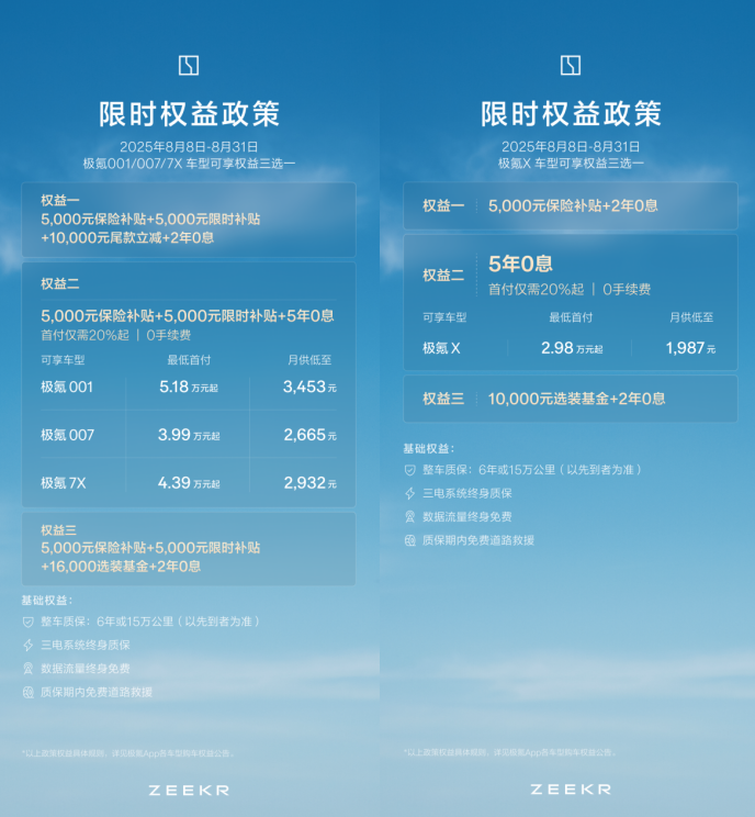 放眼整个行业,敢提前将新车配置调整及权益变化等关键信息毫无保留公开的车企,确实少之又少。而且这还没完,考虑到面对即将到来的产品更新,新老用户难免在“早买早享受”和“等待新款”之间犹豫,极氪还同步调整了新的购车政策:极氪001、极氪007、极氪7X可享5000元保险补贴+5000元限时补贴,以及5年0息,首付20%起,0手续费的限时权益政策。按此计算的话,极氪001最低首付5.18万元起,月供低至3453元;极氪007最低首付3.99万元起,月供低至2665元;极氪7X最低首付4.39万元起,月供低至2932元。极氪X同样能享受5年0息,首付20%起,0手续费的限时权益,最低首付只要2.98万元起,月供低至1987元。另外,极氪一并推出丰厚的选装礼包,并表示在产品更新上市后,购车权益将同步相应调整。
