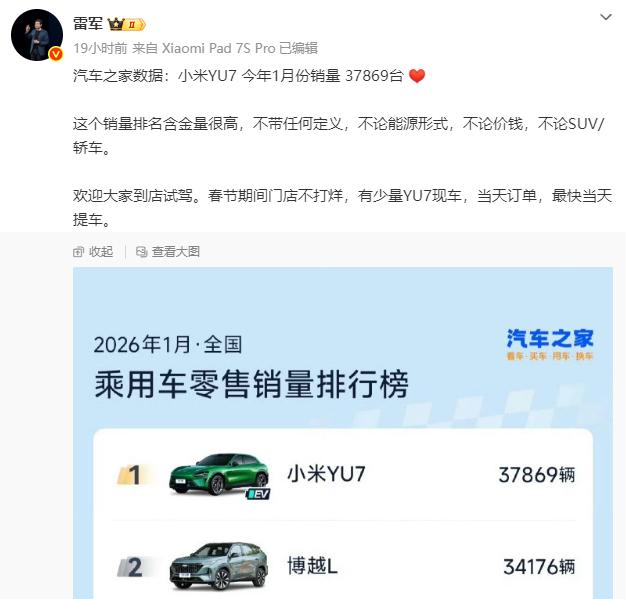 2月12日,雷军发文称,小米YU7今年1月的销量达37869台。按照第三方平台的排行榜,小米YU7为1月乘用车零售销量冠军。他表示:“这个排名含金量很高,不带任何定义,不论能源形式,不论价钱,不论SUV/轿车。”