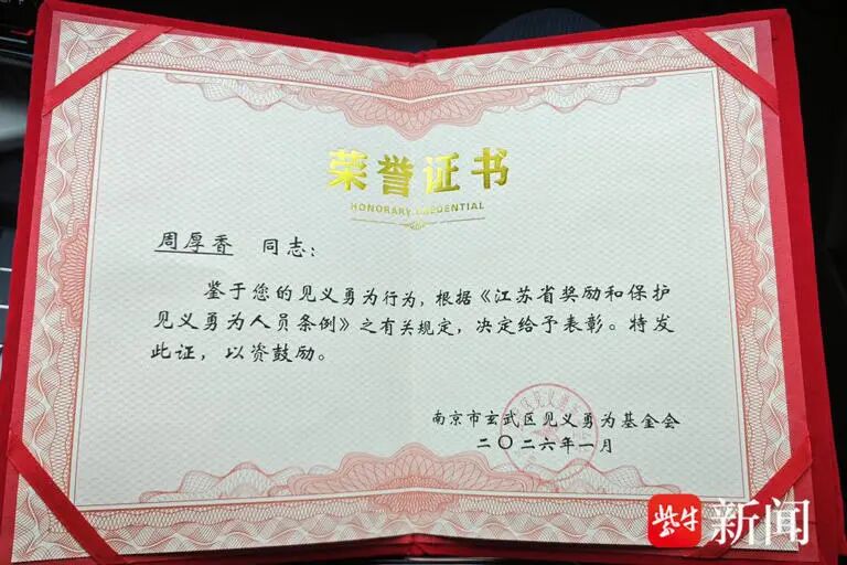 02 送奖上门,不让好人多跑一步路2月5日,南京市玄武区见义勇为基金会专门为周厚香举办了授奖仪式,可惜他已回六安老家过年。按常规做法,可以等他年后回南京再补领,但梅园新村街道办事处副主任马科祥说了:“我们就想着,别让好人再多跑一趟。”