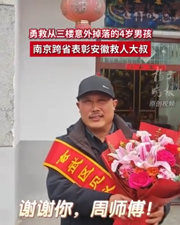 “哪来得及想啥呀,就一个念头——赶紧救孩子!”周师傅操着安徽口音,笑得腼腆。2月9日,他家院子里挤满了人,南京来的送奖团队驱车300多公里,把见义勇为证书送到他手上。