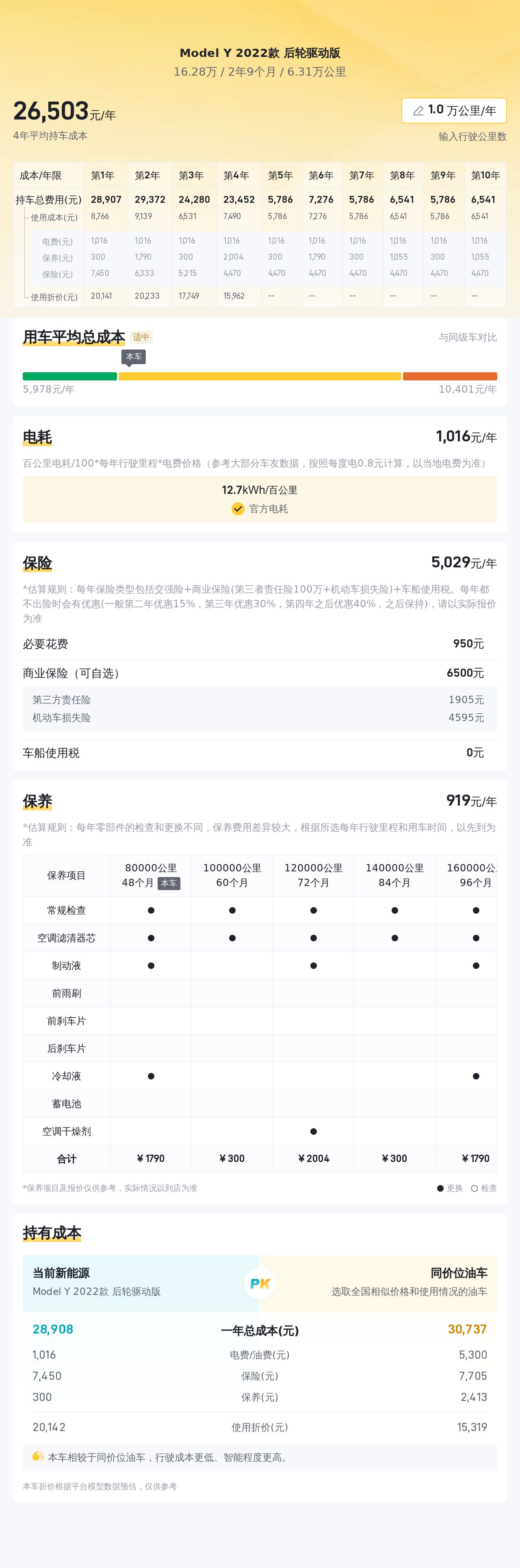 在用车成本方面,根据相关数据显示,Model Y 2022款 后轮驱动版的年均综合用车成本约为 2.7 万元左右。这个数字可能会根据车主的驾驶习惯、用车频率以及地区差异等因素有所变动。