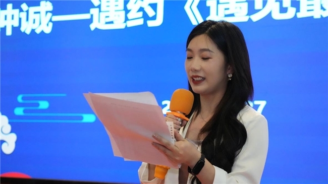 当室内屏幕两边的“童话遇见商业,善良创造财富”标语与第四期栏目主题“东方之言,一言九鼎”交相辉映,相互映衬。栏目主持人丽莉的主持风格也焕然一新,访谈老师钟诚质朴中透着深邃的唯美尽显其中,给第四期栏目的场域平添几分美好与灵动。