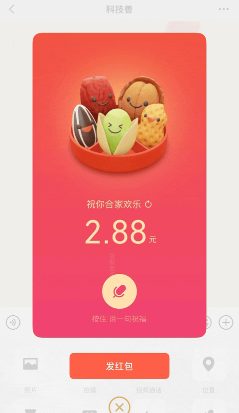 在发红包入口选择拜年红包即可使用,可以随机 9.99、8.88、6.66 等吉利金额和祝福,主打节日氛围。