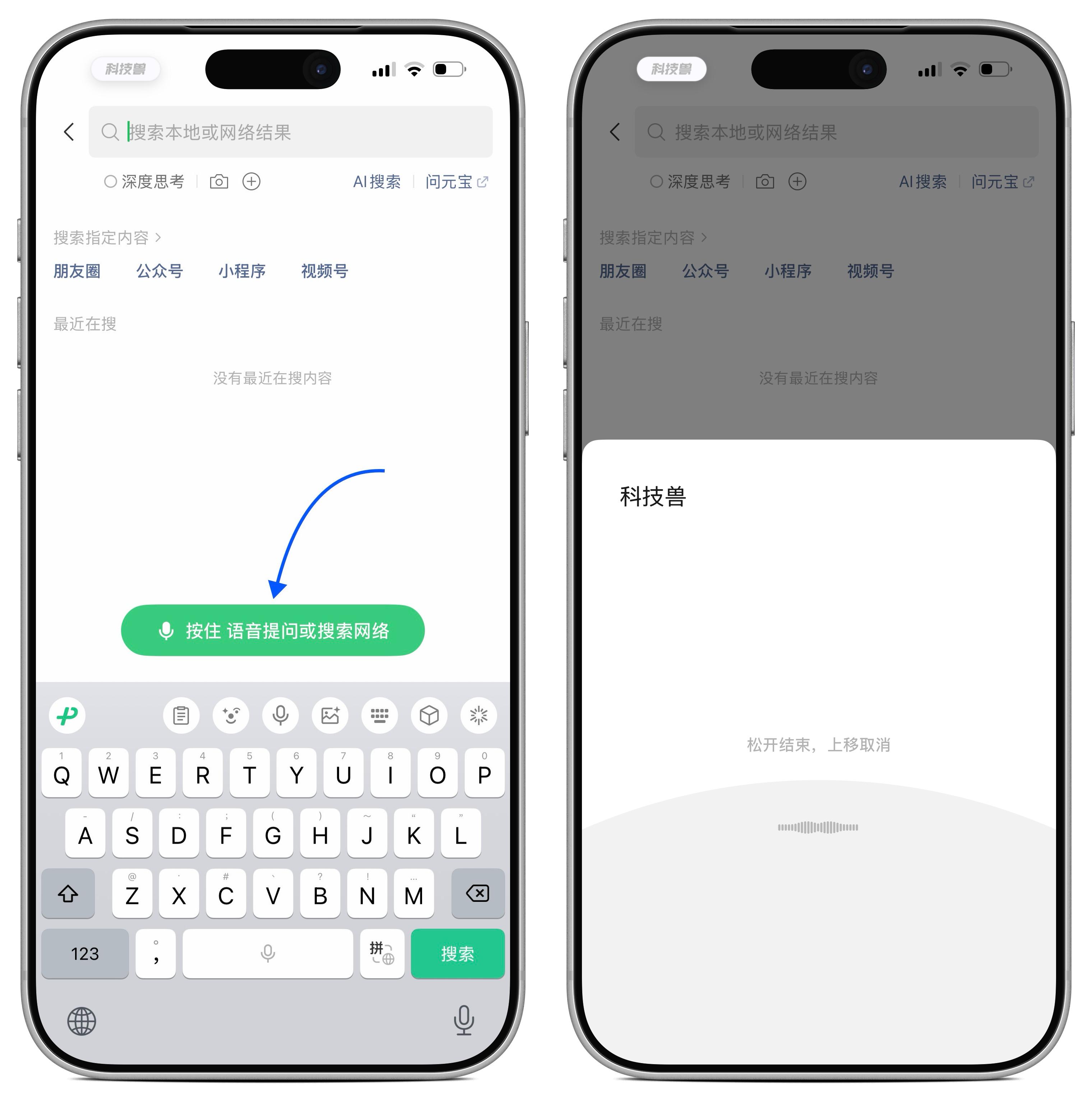 搜一搜界面变化微信「搜一搜」的语音按钮也通过热更新换成了更醒目的绿色样式。支持长按直接语音提问或进行网络搜索,视觉识别度更高。