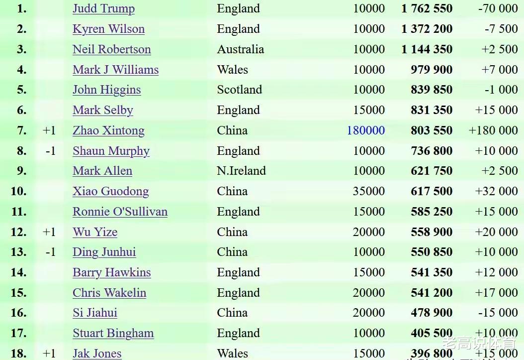 新科大奖赛冠军赵心童因为收入18万英镑奖金,总奖金来到80.355万镑,超越73.68万镑的魔术师墨菲,升至第七位。需要说明的是,赵心童的奖金距离排在第六的塞尔比只差不到3万英镑,这个差距只需一个比赛就可能抹平。因此,赵心童的世界排名随时都可能超越塞大师。