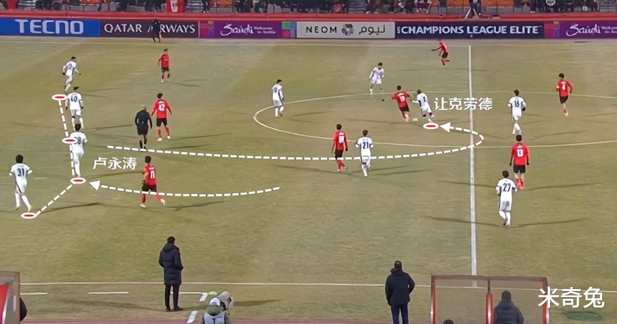 卢永涛最高光的时刻是这一次的攻防转换,当让克劳德习惯性向边路靠,扩大自己的防守范围时,卢永涛在中路高速回追,一直紧跟着对方的无球人。