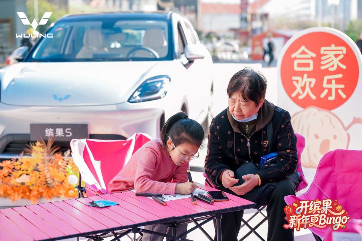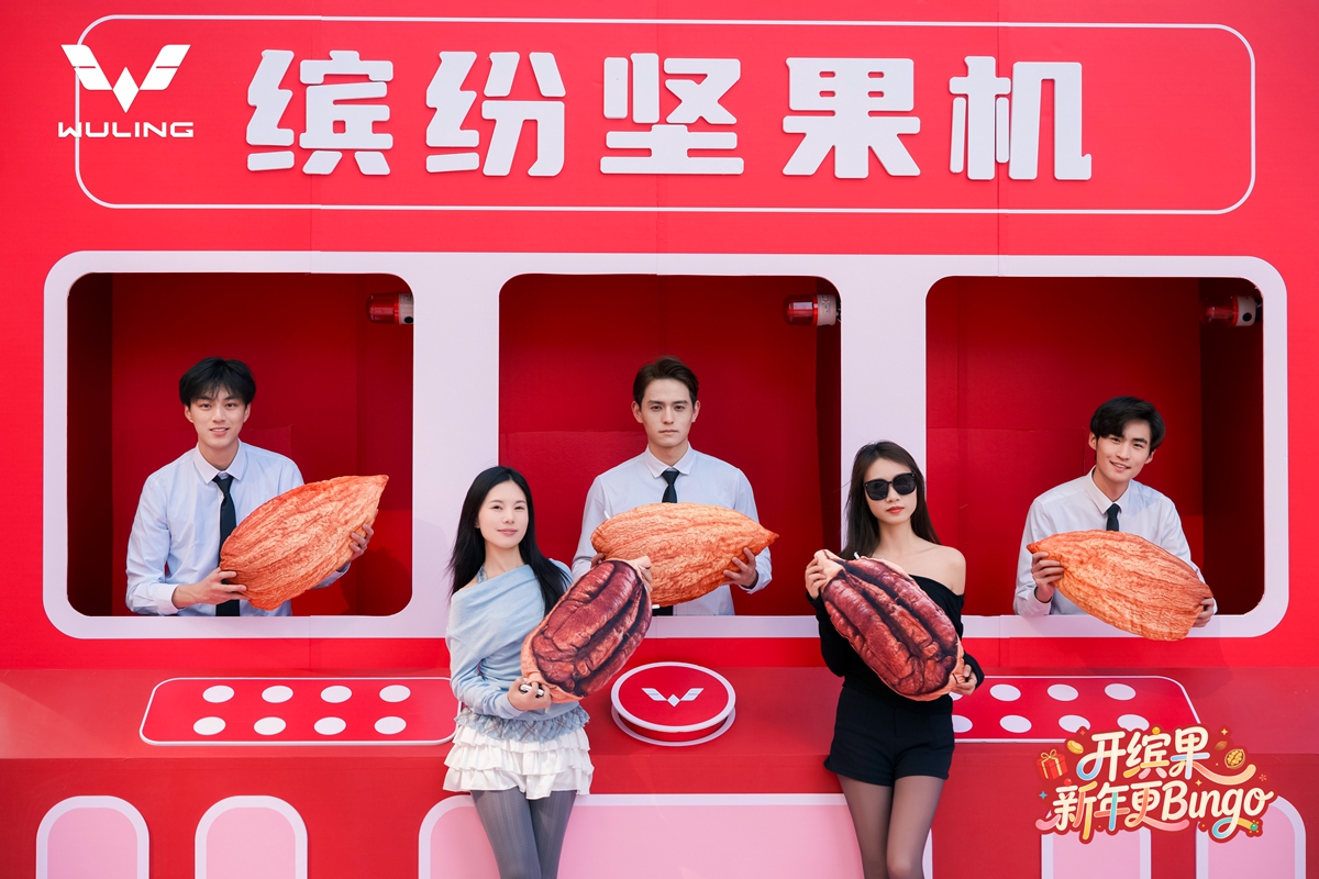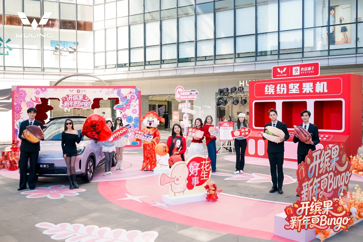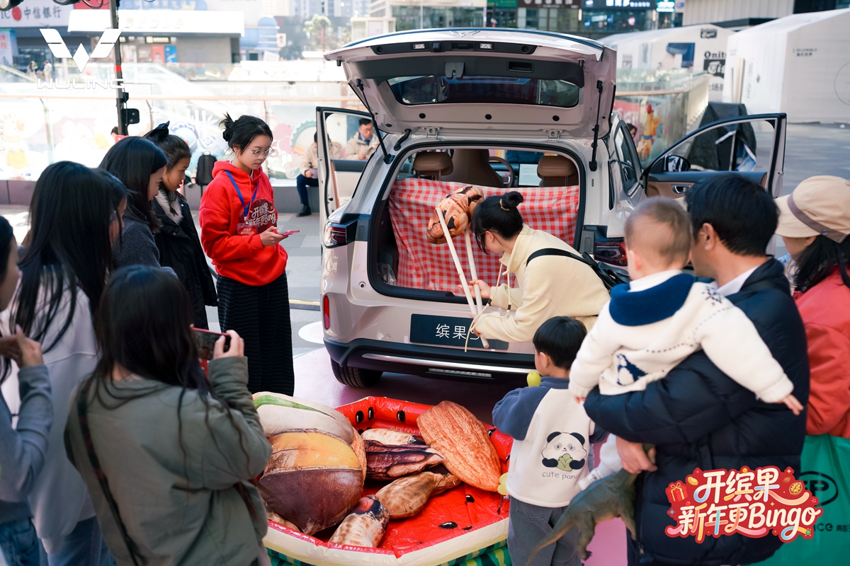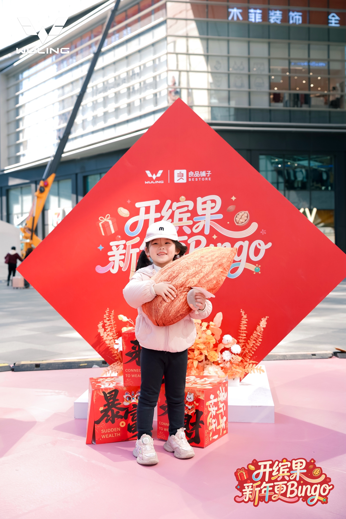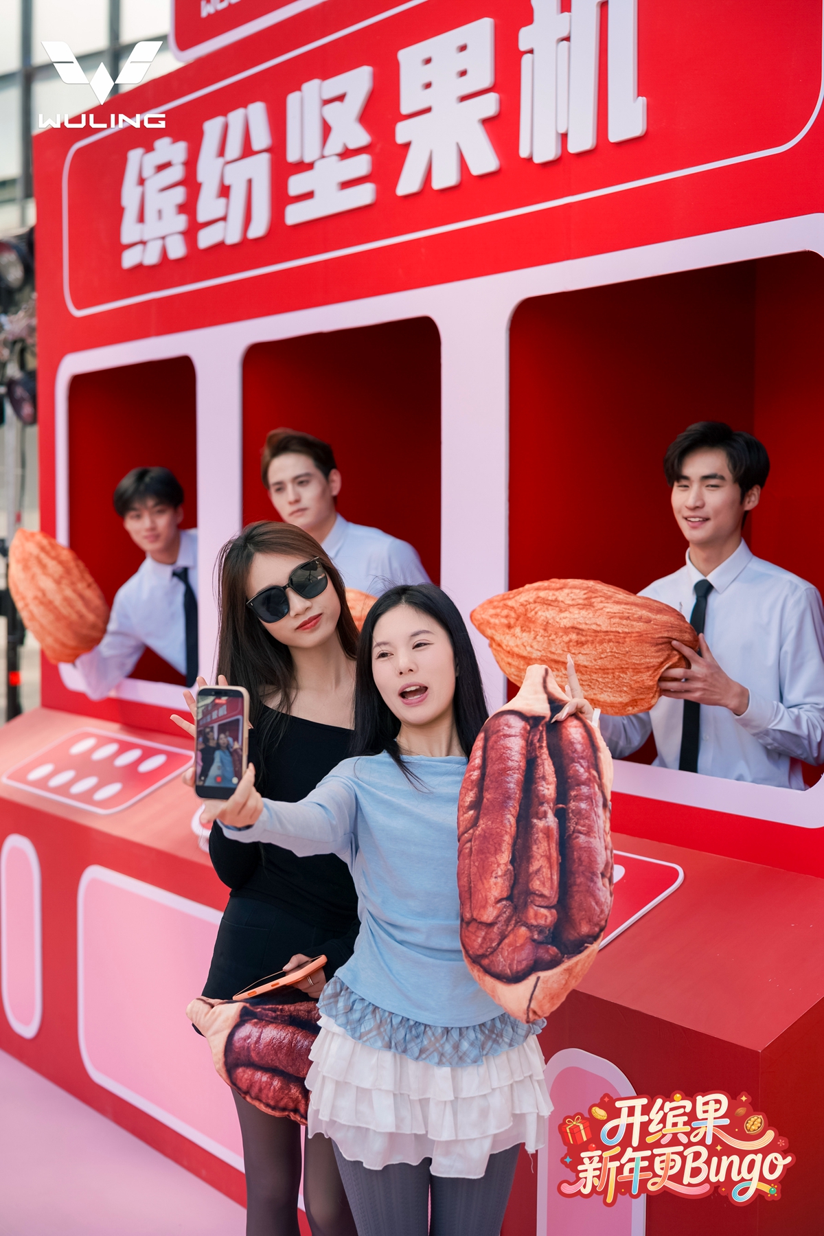快闪活动现场化身新春“送福驿站”,一个巨大的五菱与良品铺子新春联名礼盒映入眼帘,宾客们不仅第一时间体验了五菱缤果家族的灵动驾趣与出色空间,更参与了“缤纷坚果机”、“吉祥年画DIY涂鸦”“后备箱快乐夹坚果”等创意互动。笑声与惊喜此起彼伏,每一辆缤果都仿佛成了传递福气的“新年幸运座驾”。现场洋溢的温暖与活力,正是“人民需要什么,五菱就造什么”的生动写照——我们造车,更创造与用户共鸣的快乐与祝福。