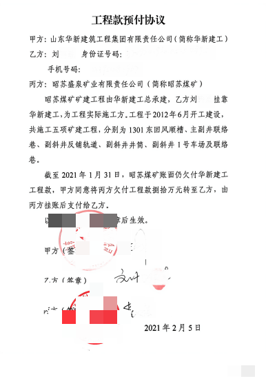 工程履约结款拖欠,对账明确欠款金额2012年6月,刘先生挂靠山东华新建筑工程集团有限责任公司,成为昭苏盛泉矿业有限责任公司矿建工程的实际施工方,承接了1301东回风顺槽、主副井联络巷、副斜井反铺轨道、副斜井井筒、副斜井车场及联络巷等核心矿建工程。据刘先生介绍,工程自开工后严格按照矿方要求施工,2013年已全部施工完毕并验收合格,2016年完成整体结算审计,各项流程均符合行业规范及合同约定。