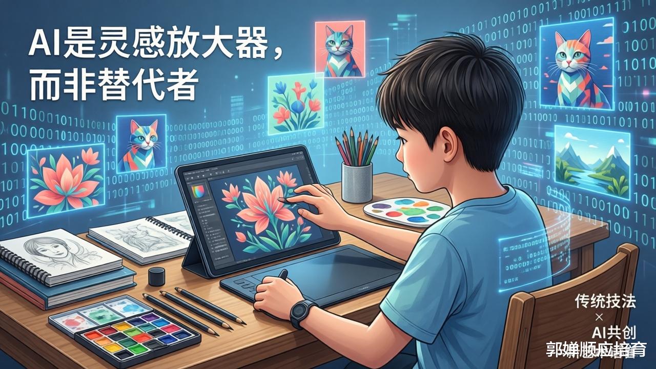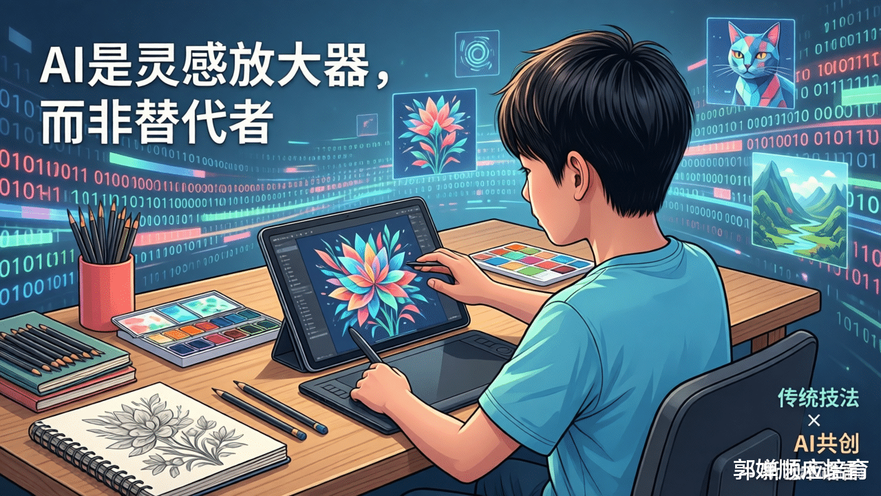 这个事情是这样的,孩子按部就班地学习绘画准没错,在绘画领域一直深耕,达到一个比较高的水平,同时熟悉AI绘画工具。