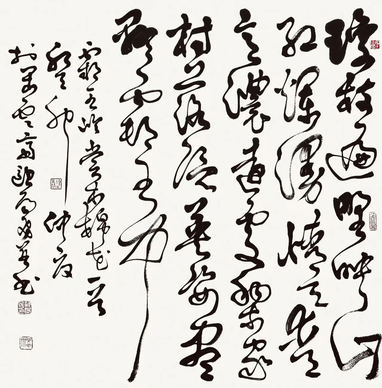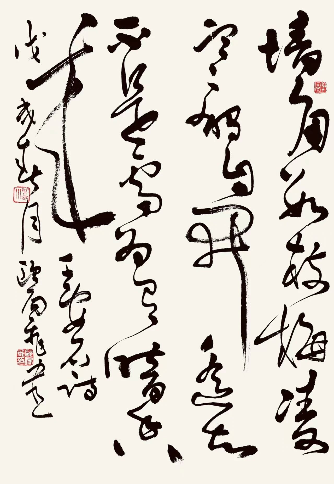 草书创作应该表现出一种和个人生命感受交融的内涵。因为书法表述的是根植于我们生命中的文化,是凝固化的线条表达,是流动中的生命感受,是字体之中所渗出的个人学养。