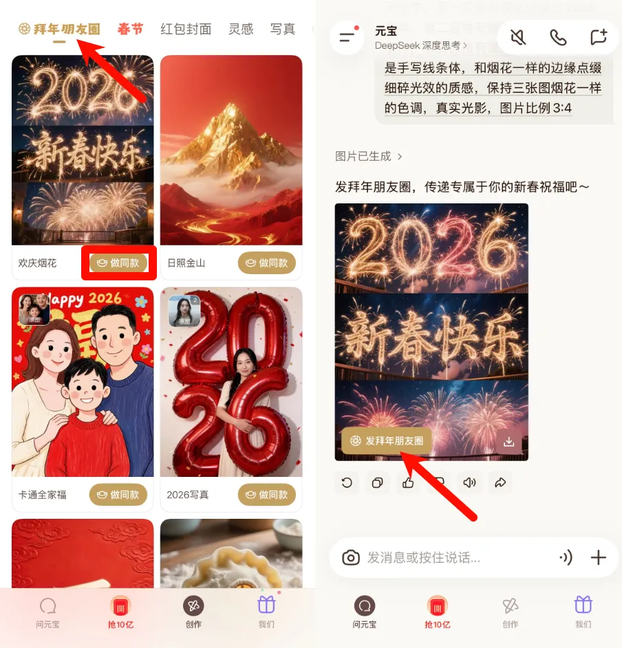 打开腾讯元宝 App,在下方点击创作,选择「拜年朋友圈」。