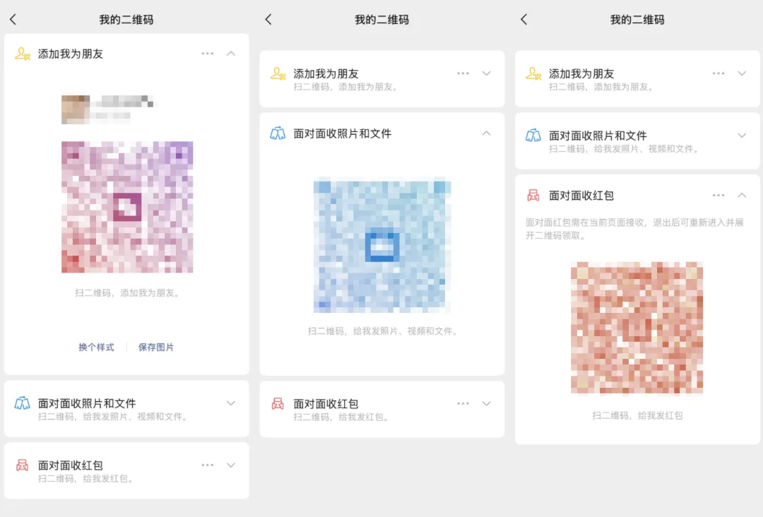 除了添加好友用的二维码之外,还加入了「面对面收照片和文件」以及「面对面收红包」。