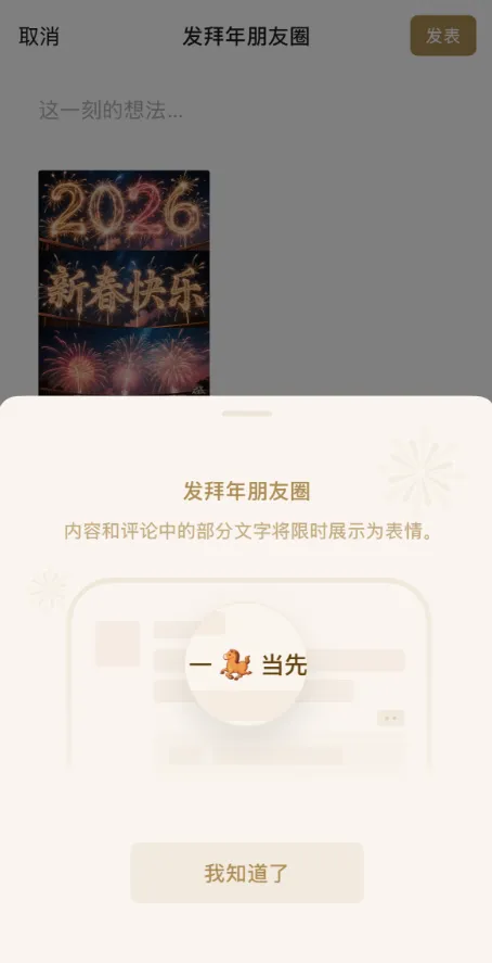 通过元宝 AI 完成生成之后,就可以点击下方的「发拜年朋友圈」了。