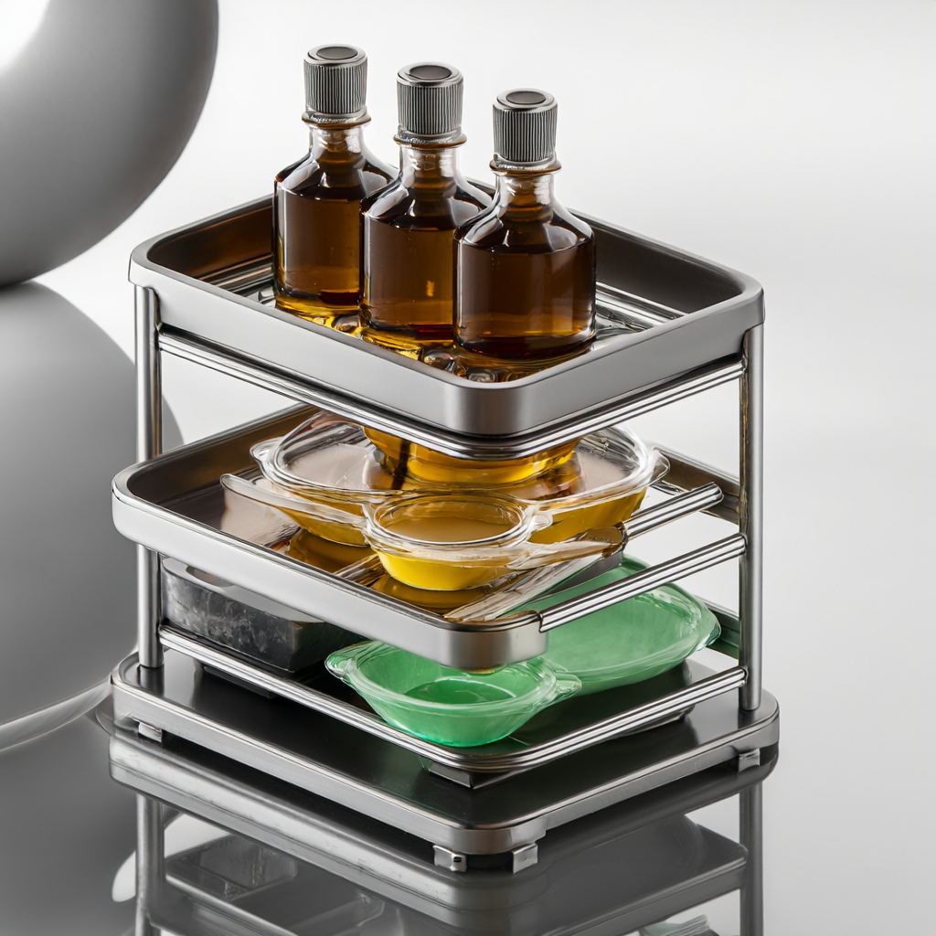 如果说刀架解决了锋利工具的收纳问题,那么双层台面置物架则是我处理瓶瓶罐罐的得力助手。我选择的这款置物架采用不锈钢材质,两层设计,尺寸刚好适合我的小台面。