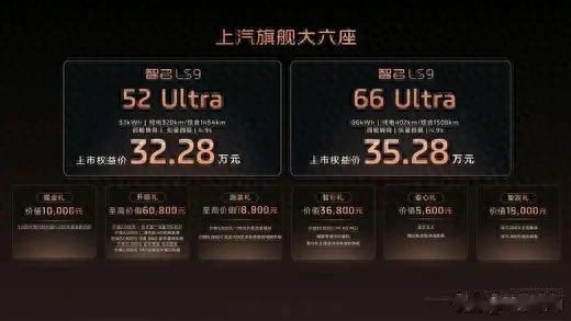 新车推出两个超级增程版本:52 Ultra版权益价32.28万元,66 Ultra版权益价35.28万元。全系标配150多项行业领先配置,重新诠释了中高端大六座SUV的价值标准。