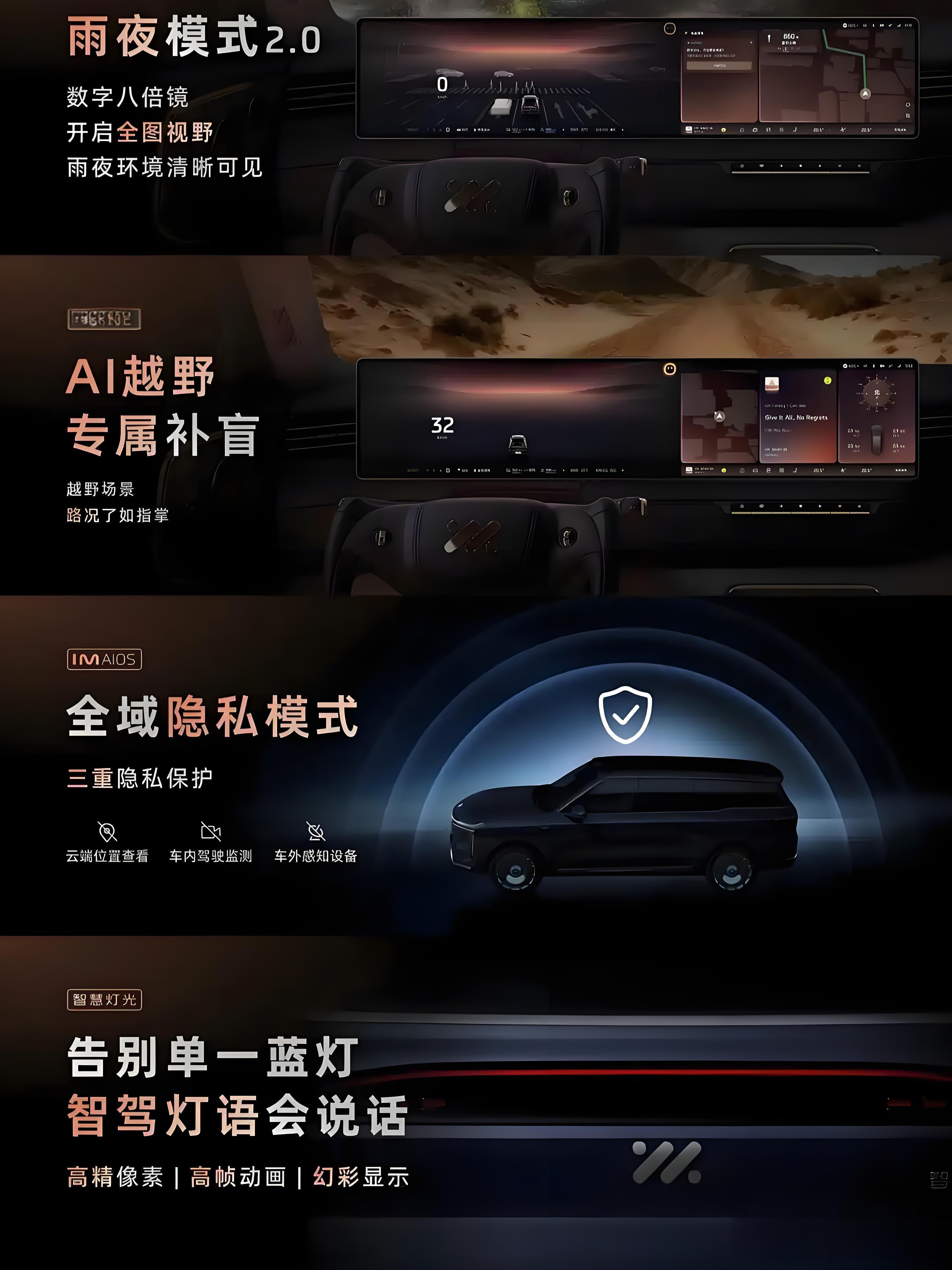 AI Agent智能管家融入座舱,停车缴费、外卖点单,车辆化身移动生活枢纽。“雨夜模式2.0”提升恶劣天气视野,一键隐私功能通过三重物理防护,打造安心私密空间。