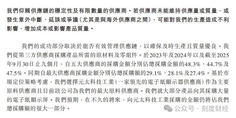 更棘手的是供应链风险,文石的最大供应商是元太科技,2023年至2025年前三季度,向元太科技的采购额占比分别达29.1%、28.1%、27.4%,主要采购电子纸显示屏。