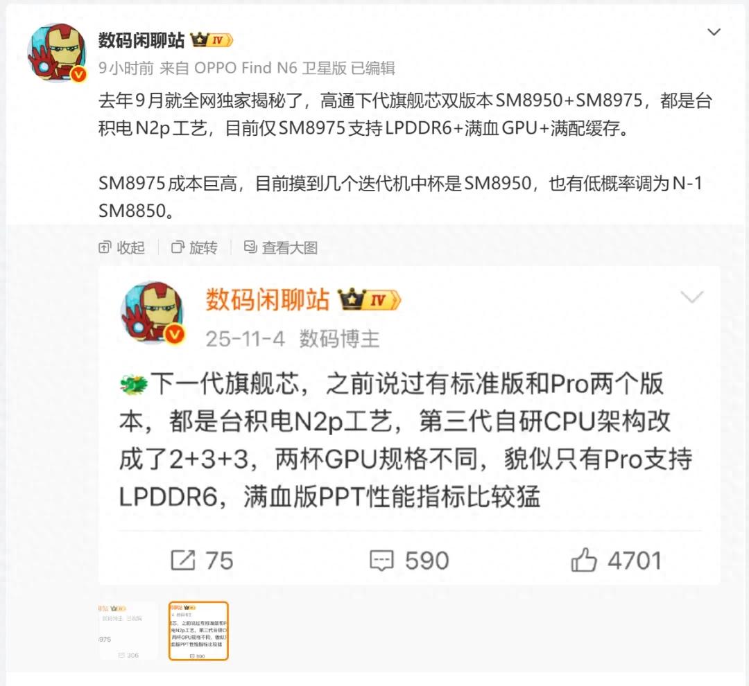 其中,前者预计是骁龙8 Elite Gen 5的正式迭代产品,将会支持最新的LPDDR6运存以及满血的GPU和满配的缓存。