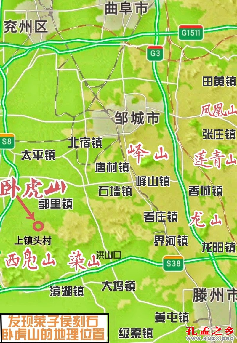 卧虎山在邹城市西南15公里郭里镇镇头村后,位于滕州市西北方向22公里,隔染山与卧虎山而相望。