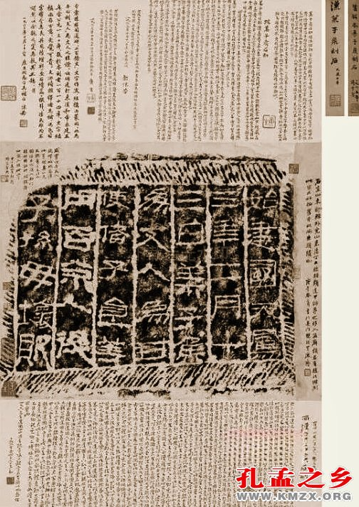 今根据“莱子侯刻石”外观看,形状略微呈方体,只有一面磨光刻字,其他五面皆自然,并未严细修整与凿磨,显然除了字面外,相邻四面是砌入祠堂墙里的。