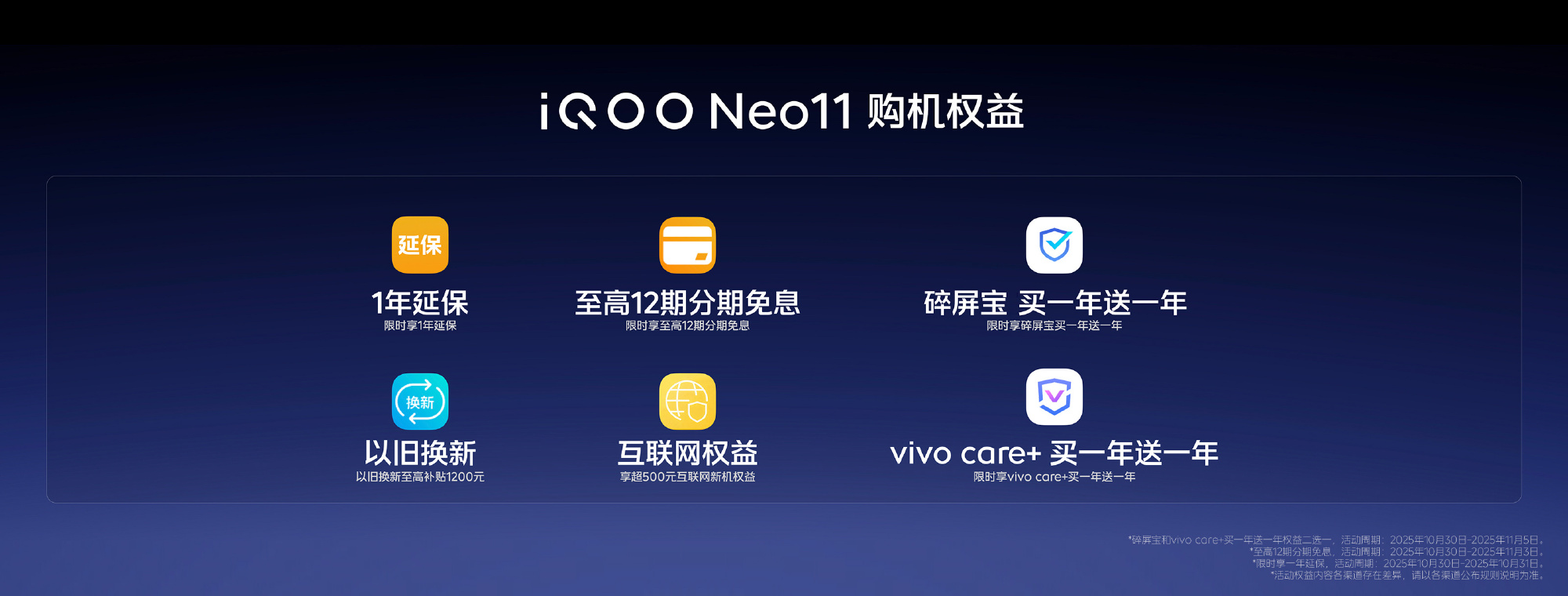 10月30日19:00,iQOO Neo11正式发布并同步开售。对于想在中端价位选到“无短板”机型的用户来说,它不仅避开了同档产品常见的“硬件缩水”“软件适配差”等问题,更将旗舰级配置集中下放,无论是学生党日常使用,还是手游玩家追求高性能,都能精准匹配需求,堪称近期购机清单里的潜力黑马。