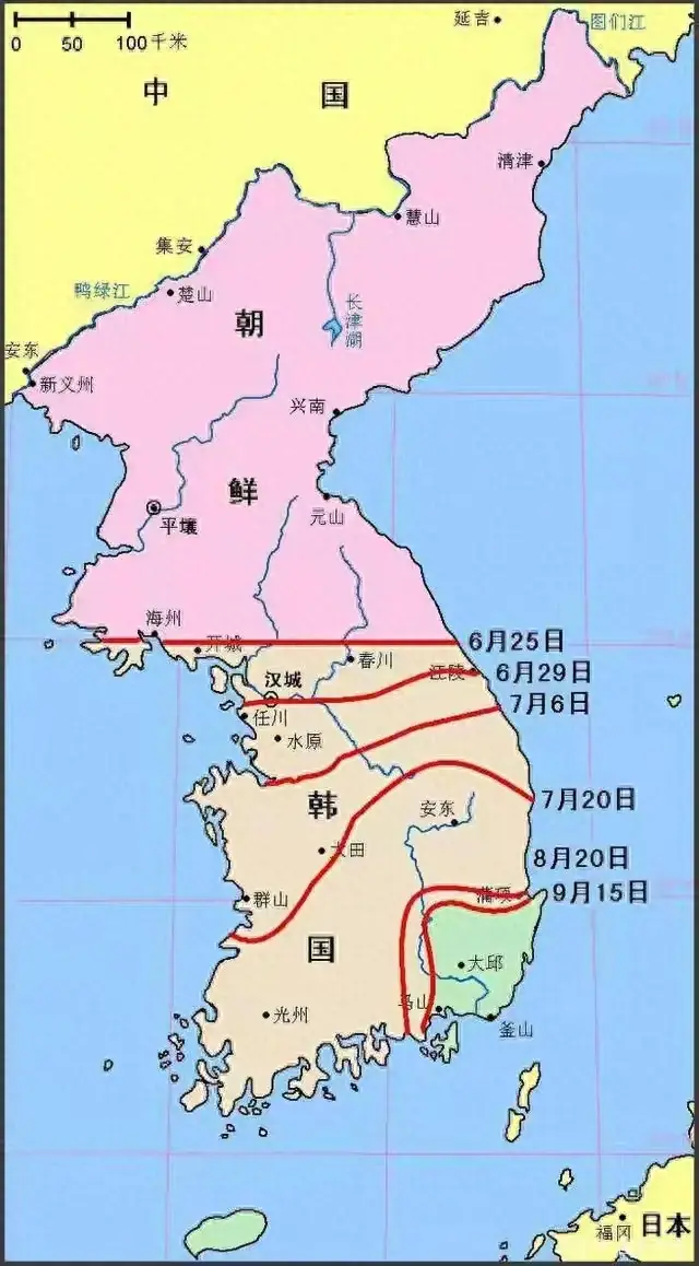 1950年6月25日,朝鲜的领导人金日成认为自己有了统一祖国的实力,于是率领人民军越过三八线南下,朝鲜内战爆发。战争的初期,依靠苏联的援助和人民军的英勇,一路势如破竹,击溃了韩国军队,同年九月,韩国军队被围困在釜山周边一小块区域。