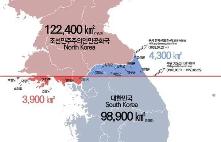 我们从下面这个图可以看出,韩国占领了更多的领土,为4300平方千米,朝鲜只占领了3900平方千米,看起来好像是朝鲜更加吃亏,但是朝鲜领导人却认为占了大便宜。