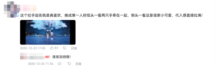 游戏众多大卖点里,我首推这段“牵手”的互动展示,绝美的场景结合蜜糖般甘甜的氛围,也成了玩家弹幕最密集、刷屏最猛的名场面。