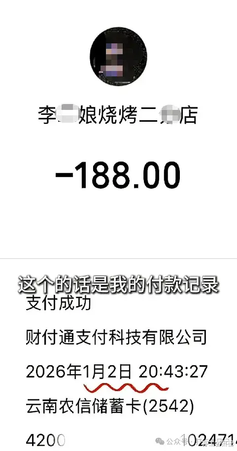 其实在1月2号的时候,5位顾客在烧烤店内共消费了188元,并且有着明确的微信支付记录,清晰地写着他们在当晚20:43通过微信扫码完成了支付。